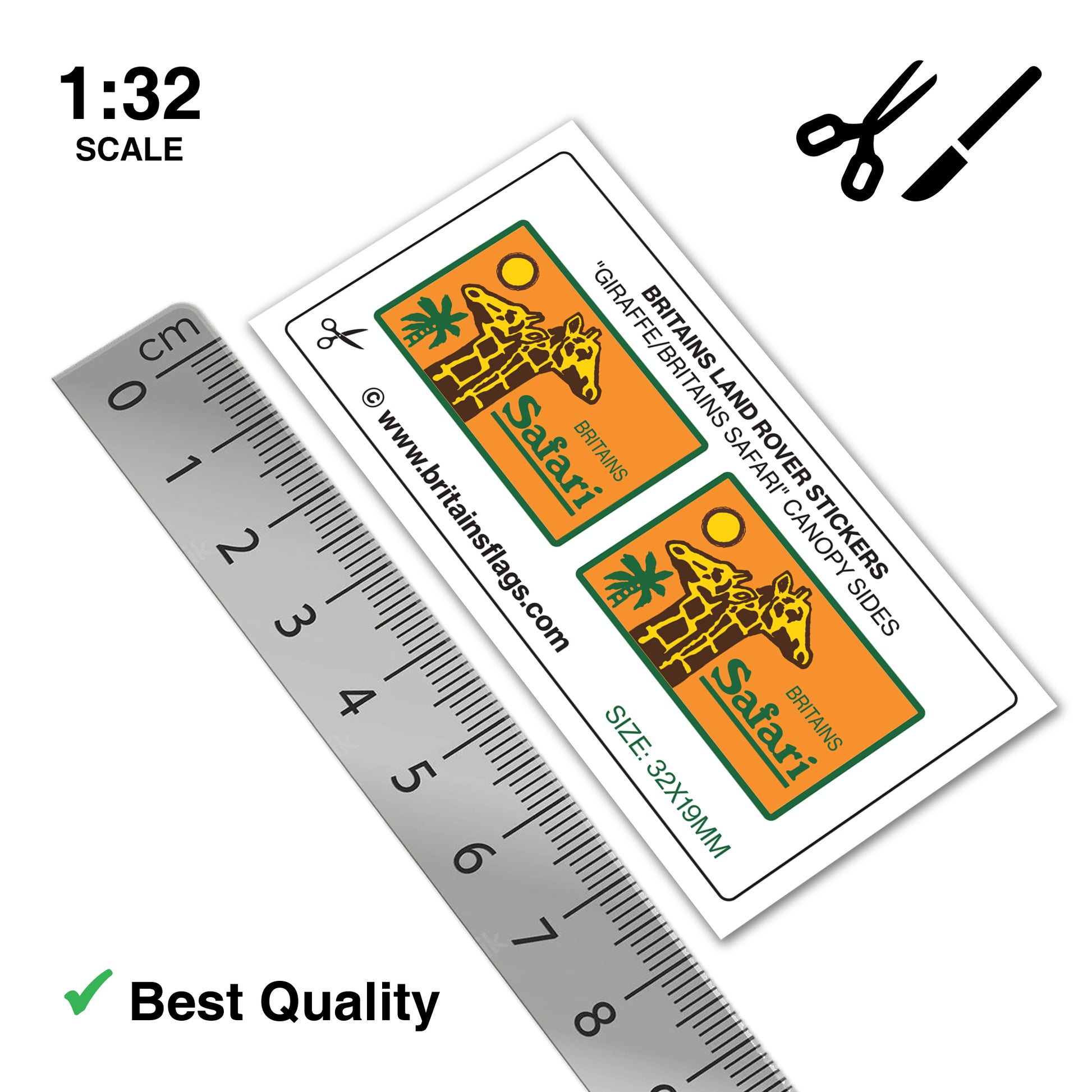 See image as a guide to the sizes. Suitable for the Britains Deetail Safari SWB (Short-Wheel-Base) Land Rover vehicle. Approx. size of sheet: 80mm x 40mm. Size of individual stickers (once cut out): 32mm x 19mm
