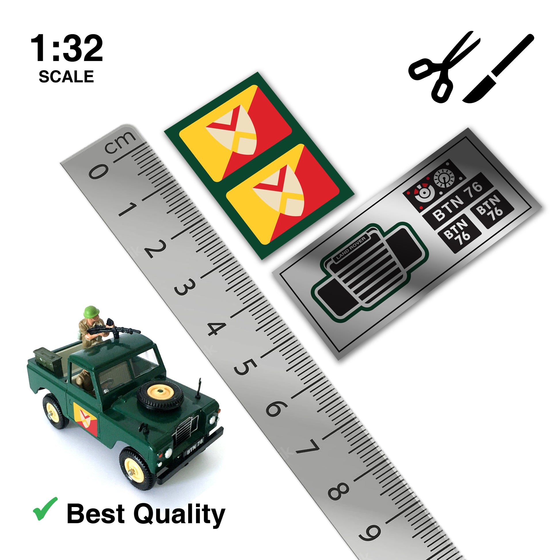 BRITAINS DEETAIL STYLE British Army WW2 Land Rover Labels/Stickers (High Quality) for 1/32 Scale Vehicles. Could also be used for other 1:32 Scale vehicles across other toy ranges but these are designed with the Britains Land Rovers in mind. Here you have the FOIL elements including the number plates (front and back, one spare), the instrument panel, the front grille/radiator; You also have the side markings (shield on red/yellow motif).