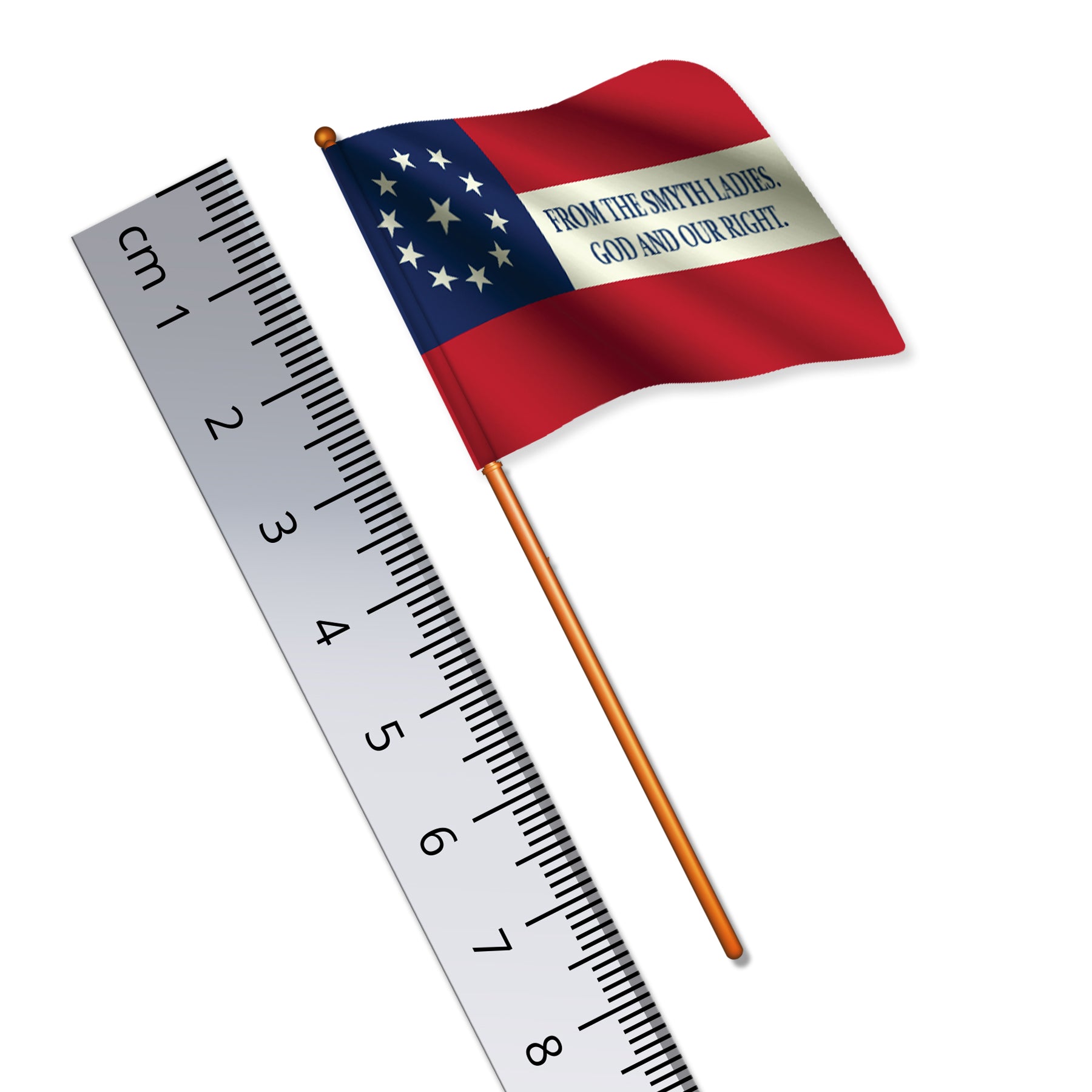 The Confederacy's first official national flag, often called the Stars and Bars, flew from March 4, 1861, to May 1, 1863. This version of the flag features a circle of ten white stars surrounding an eleventh central star in the navy-blue canton, representing the states of the South that composed the Confederacy. Within the white stripe, or bar, are the words: "From the Smyth Ladies. God and our right."