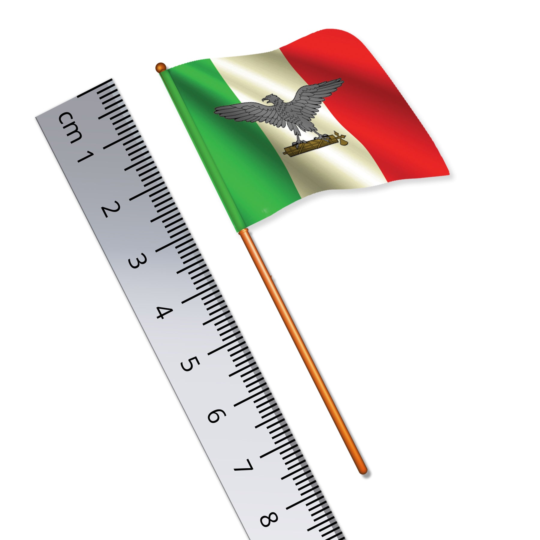 The national flag of the short-lived Fascist state in northern Italy, the Italian Social Republic (1943–1945), or "Republic of Salò" as it was commonly known, was identical to the flag of the modern Italian Republic, as both republics used the previous flag of the Kingdom of Italy with the coat of arms of Savoy removed. This flag was somewhat rarely seen, however, while the war flag, charged with a silver/black eagle clutching horizontally placed fascio littorio (literally, bundles of the lictors), was very common in propaganda. (©Wikipedia)