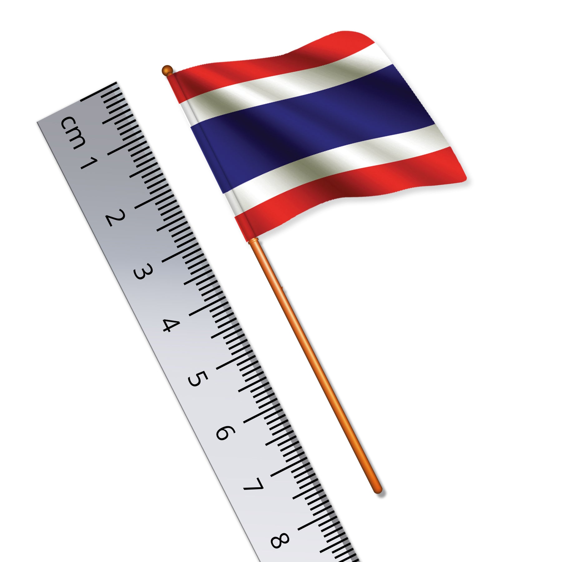 The flag of Thailand shows five horizontal stripes in the colours red, white, blue, white and red, with the central blue stripe being twice as wide as each of the other four. The design was adopted on 28 September 1917, according to the royal decree issued by Rama VI. Since 2016, that day is a national day of importance in Thailand celebrating the flag. The colours are said to stand for nation-religion-king, an unofficial motto of Thailand, red for the land and people, white for religions and blue for the monarchy, the last having been the auspicious colour of Rama VI. As the king declared war on Germany that July, some note the flag now bore the same colours as those of the UK, France, Russia and the United States. (©Wikipedia)