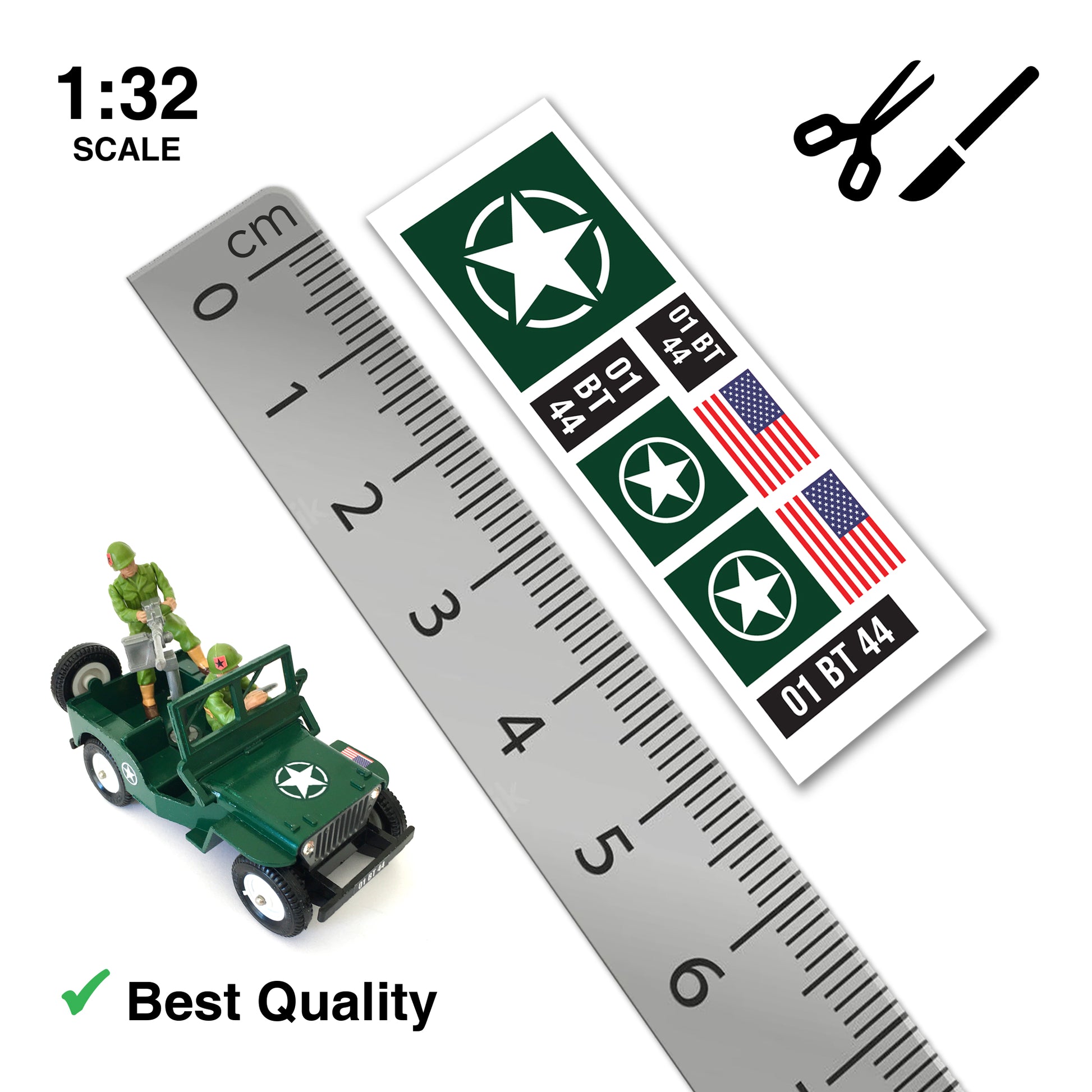 BRITAINS DEETAIL STYLE American WW2 Willys Jeep Labels/Stickers (High Quality) for 1/32 Scale Vehicles. Could also be used for other 1:32 Scale vehicles across other toy ranges but these are designed with the Britains Jeep in mind.